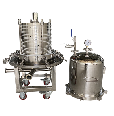 本機(jī)過濾裝置是由多層重疊過濾網(wǎng)板和框組成,原液體經(jīng)過加壓進(jìn)入桶體內(nèi),從框外邊孔進(jìn)入再經(jīng)網(wǎng)板上的過濾介質(zhì),從網(wǎng)板多個(gè)小孔出來(lái),合格液體排出口。濾材可選用聚丙烯濾膜、增強(qiáng)型濾膜、濾紙、濾布、不銹鋼篩網(wǎng)、尼龍篩網(wǎng)、本機(jī)專用濾膜等,可根據(jù)用戶選用合格的耗材。